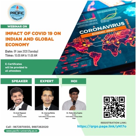 Pacific Institute of Business Studies, Pacific University, Udaipur (Raj.) organized a webinar on “Impact of COVID 19 on Indian and Global Economy” on Tuesday June 09, 2020. Practicing Chartered Accountant Arpit Rajawat was Speaker with Dr. Anurag Mehta as Expert in the webinar. CA Arpit Rajawat expressed views on Impact of COVID 19 on Indian Economy and said that since Indian economy is having huge domestic demand and not fully reliant on foreign trade hence the global economic slowdown will not severely affect Indian industries. Though the GDP will will accelerate at a slower rate i.e. 3% in 2020 and thus there will be less impact of COVID 19 on Indian Economy. He emphasized that as Indian Economy has opened its gates for foreign direct investments so the foreign companies working in China may shift their business from China to India. This will generate more revenue and employment in India. Economy will recover very soon as it recovered from 2008 Global Recession.